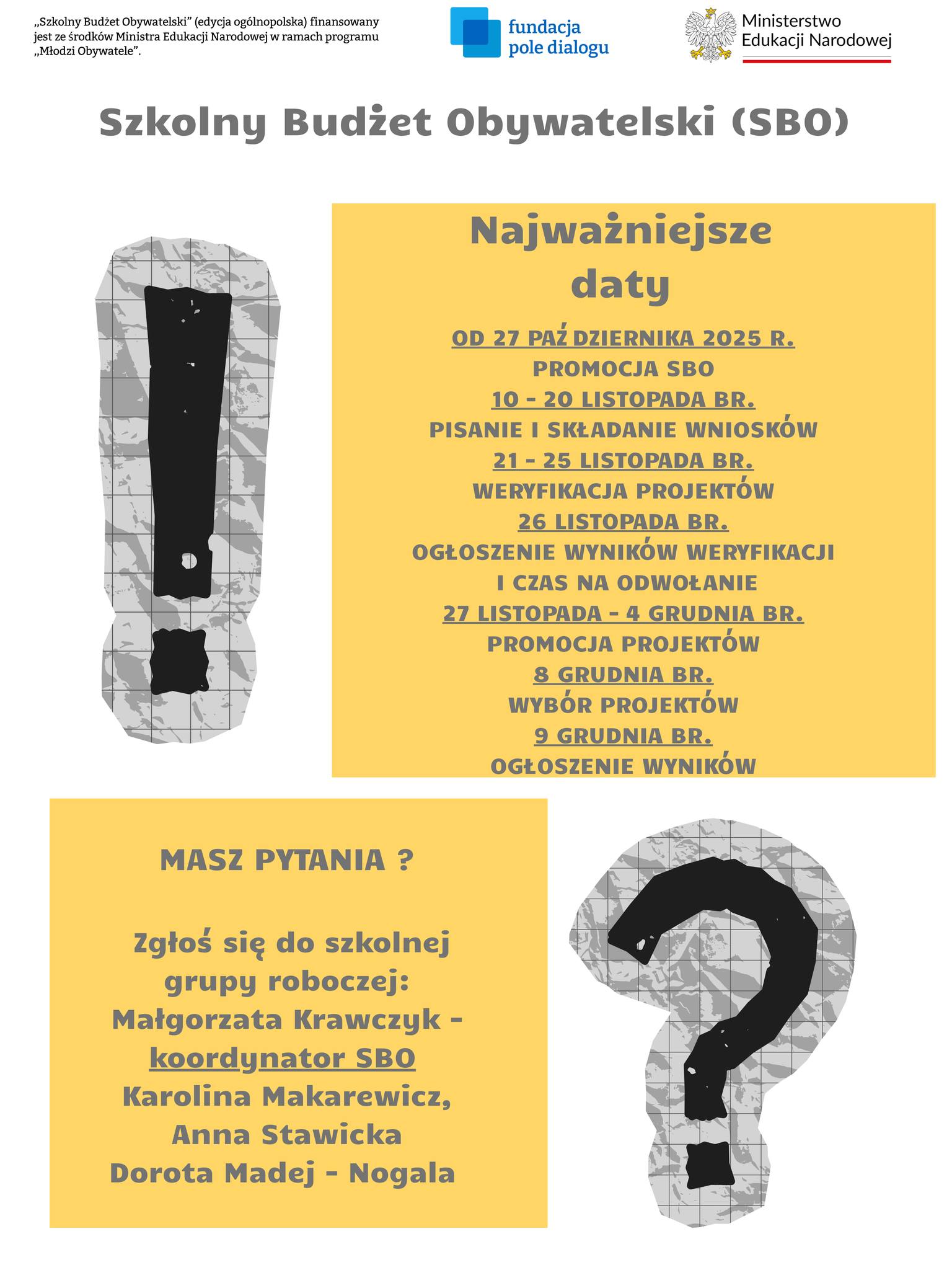 Właśnie startujemy ze Szkolnym Budżetem Obywatelskim (SBO) – projekt, w którym to wy, uczennice i uczniowie, decydujecie, na co przeznaczyć część szkolnego budżetu. Możesz zgłosić swój pomysł, stworzyć projekt, a potem głosować na ten, który uznasz za najlepszy.